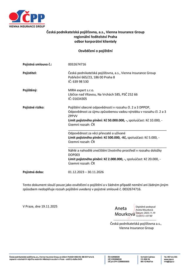 Naše společnost má uzavřenu pojistnou smlouvu na škody vzniklé při výkonu své činnosti.